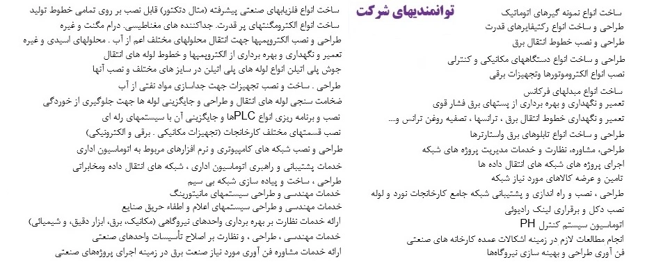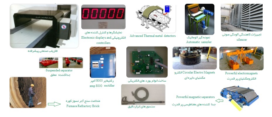 فلزیابهای صنعتی پیشرفته ، الکترومگنتهای پرقدرت ، جدا کننده های مغناطیسی پر قدرت ، نمونه گیرهای اتوماتیک ، ضخامت سنج آجر نسوز کوره و صدها دستگاههای صنعتی دیگر ، همگی برای اولین بار توسط این شرکت در ایران طراحی و به مرحله تولید در آمدند و از زمان تولید تا کنون توانسته اند نیازهای صنایع را بخوبی برطرف سازند.